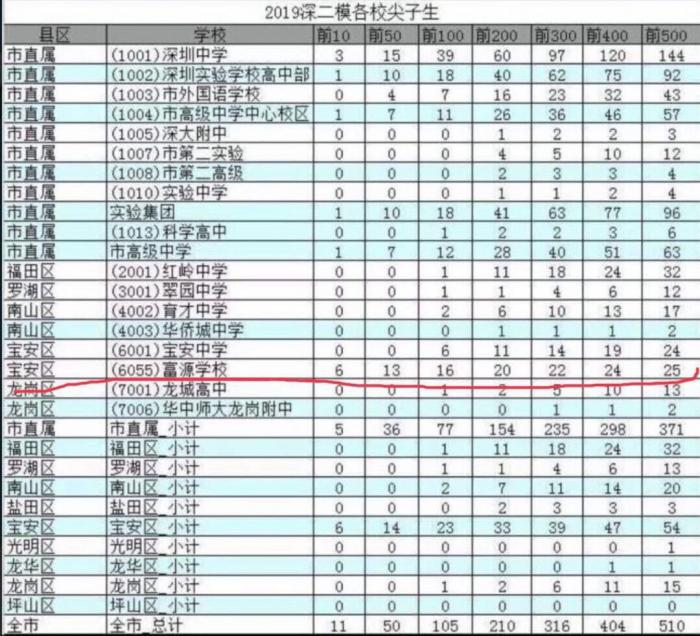 这份成绩显示,宝安区的富源学校,占据了各二模考试前10名的6席,这一成绩超过了深圳传统的四大名校——深圳中学、深圳实验中学、深圳市外国语学校和深圳高级中学。