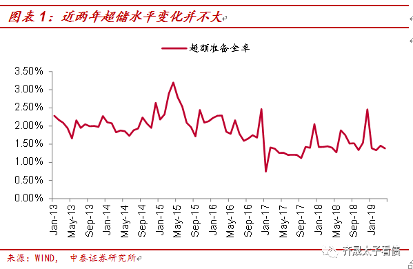从近两年情况来看,17年的超储率水平相对16年的确明显下了一个台阶,从2%以上的平台回落到1.2%-1.4%的平台。但进入18年后,尽管央行投放在感觉上更加慷慨,但实际上在补充量上并没有明显增加,除特殊时点外,超储率大部分维持在1.4%-1.5%的水平,上升的幅度并不大。同时,步入19年之后,根据我们测算,即使在4月份剩余的几个交易日中,央行不再进行任何其他操作,4月末超储率虽然环比有所下降,但绝对水平依然保持在1.3%-1.4%左右,从量上看的确也没有明显的收紧迹象。因此,如果我们以央行对超储的投放规模作为观测视角,此前既无明显放松,目前也无明显收紧。