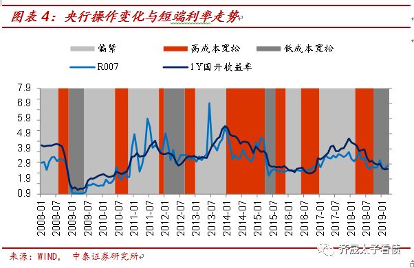 考虑其与短端利率的关系,也可以清晰的发现:当央行操作由偏紧转向宽松,或者由高成本宽松转向低成本宽松时,短端利率都具备较强下行动力,短端带动债牛形成。