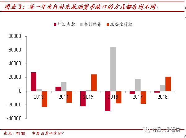 因此,我们把央行投放划分为三种模式:第一,减少银行体系超额准备金率的偏紧操作;第二,利用OMO、MLF等方式进行投放的高成本宽松操作;第三,利用外汇占款流入、降低法定存款准备金率来对冲基础货币缺口的低成本宽松操作。