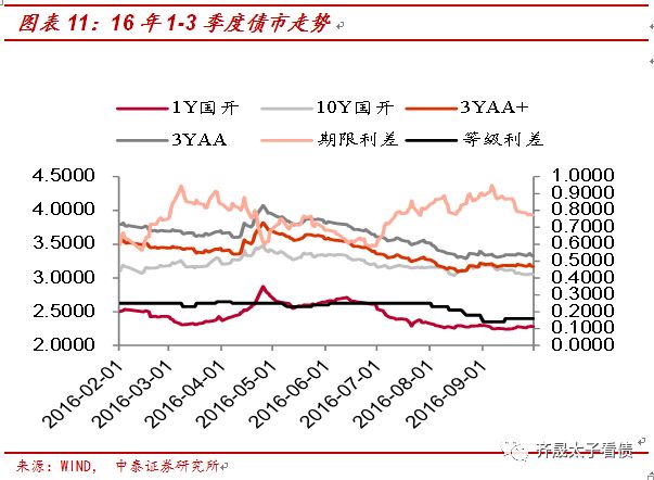 时段三:16年2-9月,城投平台融资放松等政策使得表外融资开始加速扩张,同时,委外、同业业务的快速发展使得银行对于金融市场也出现了加速扩张的状态,甚至后者扩张速度要更快,债市进入了最疯狂的阶段。但16年年底开始,由于银行对金融市场扩张速度过快,“金融去杠杆”拉开帷幕,央行开始进一步收紧,债市收益率大幅反弹。