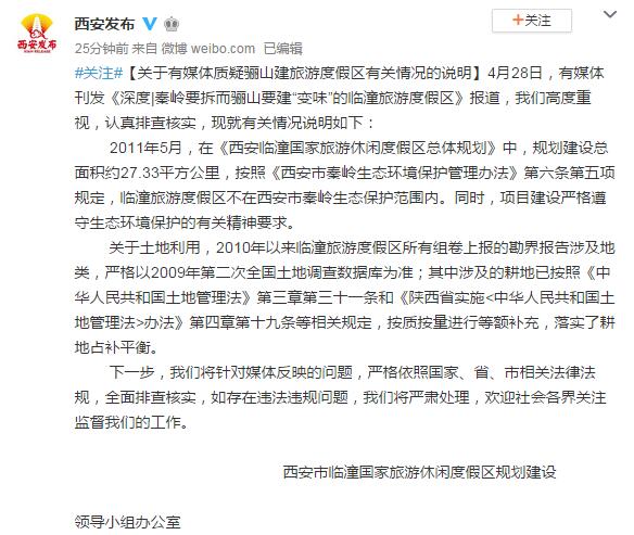 4月29日,西安市互联网信息办公室官方微博就媒体质疑骊山建旅游度假区有关情况进行说明。回应称,经认真排查核实,临潼旅游度假区不在西安市秦岭生态保护范围内。同时,项目建设严格遵守生态环境保护的有关精神要求。