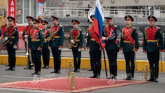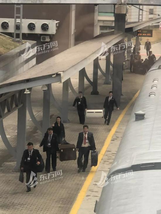 军乐队奏响两国国歌,东方网·纵相新闻现场看到,朝方代表团男性身着整齐的黑西装白衬衣,代表团中女性较少,穿着裙装,每人手中都有不少行李。
