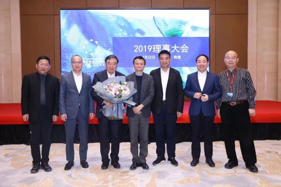 新老理事长办公会成员完成交接,从左至右依次是:徐井宏、郭广昌、马蔚华、马云、刘永好、王玉锁、刘东华