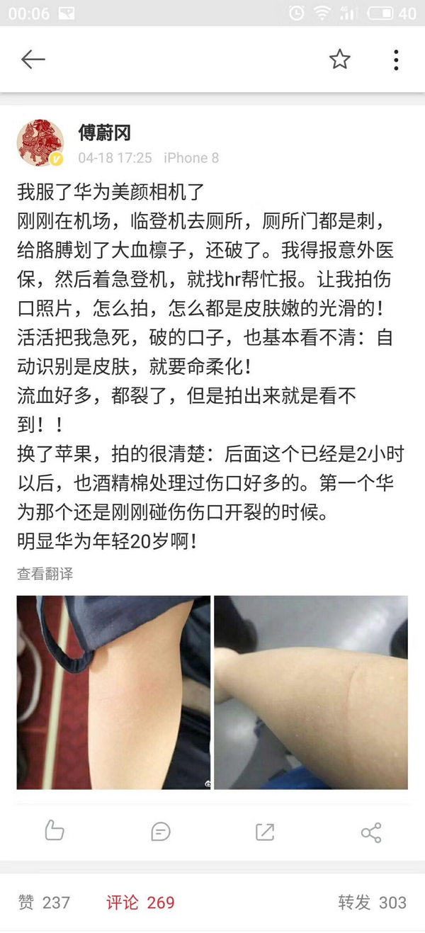 近日,微博认证为上海金融与法律研究院研究员的“傅蔚冈”称,“我服了华为美颜相机了……胳膊划了大血檩子……得报意外医保,HR让我拍伤口照片,怎么拍,怎么都是皮肤嫩的光滑的!活活把我急死,破的口子,也基本看不清”;“流血好多,都裂了,但是拍出来就是看不到!!”《中国经营报》记者核实得知,“傅蔚刚”在微博上吐槽的是其朋友——一家总部位于上海的医药企业高管的故事,该高管姓王,为女性,吐槽对象为华为mate 20 Pro手机。