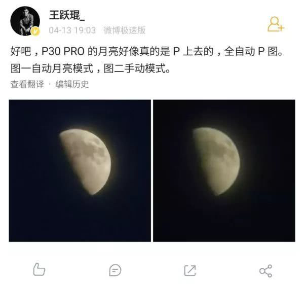 与上海王女士用华为mate 20 Pro拍伤口而伤口不见了略有不同,此前闹得沸沸扬扬的华为P30 Pro“拍月亮事件”是这样的: