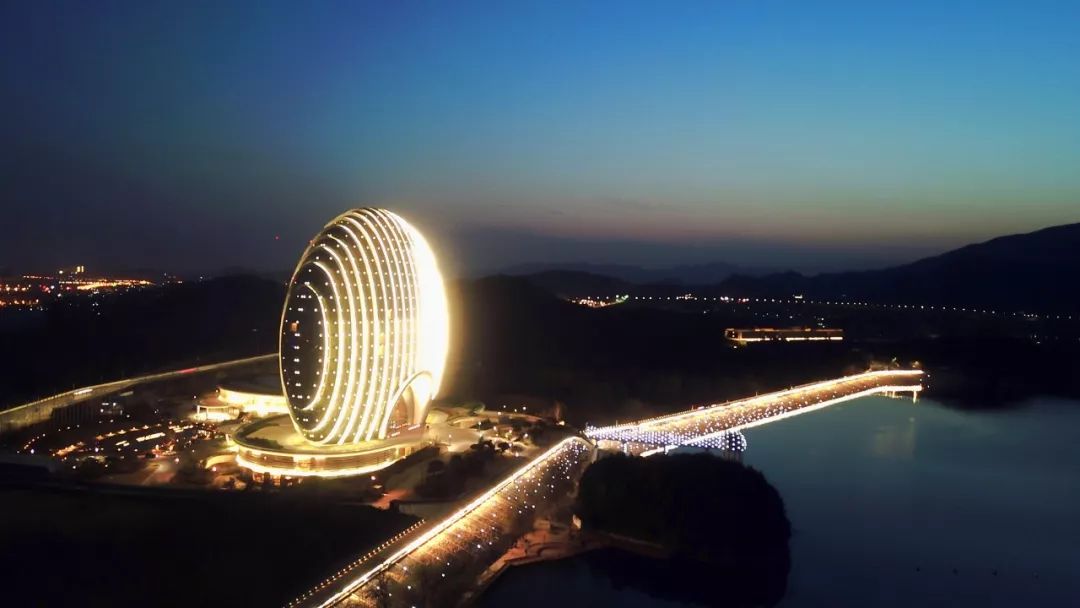 ▲这是无人机拍摄的北京雁栖湖畔的日出东方凯宾斯基酒店。(新华社记者 金良快 摄)