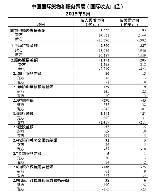 2019年3月,我国国际收支口径的国际货物和服务贸易收入14521亿元,支出13296亿元,顺差1225亿元。其中,货物贸易收入13056亿元,支出10457亿元,顺差2599亿元;服务贸易收入1465亿元,支出2839亿元,逆差1374亿元。