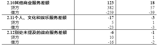 2.10其他商业服务: 指居民和非居民之间其他类型的服务,包括研发服务,专业和管理咨询服务,技术、贸易相关等服务。贷方记录我国居民向非居民提供的其他商业服务。借方记录我国居民接受的非居民其他商业服务。