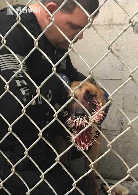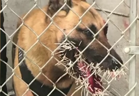 原标题:惨!警犬追捕逃犯时突遭豪猪攻击 被扎200多根刺