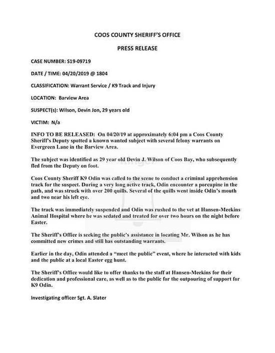 奥丁之前追踪的逃犯是29岁的戴维(Devin J。 Wilson),有多项重罪指控,目前仍然在逃。