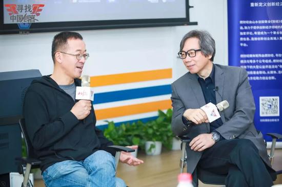 在路演开场前的中国创客导师对谈环节,寻找中国创客发起人、北京文投集团总经理戴自更和中国创客导师、新东方创始人、新东方教育科技集团董事长俞敏洪针对科技对教育的影响、创新创业以及“干活的比不过做PPT的”等多个话题展开讨论。