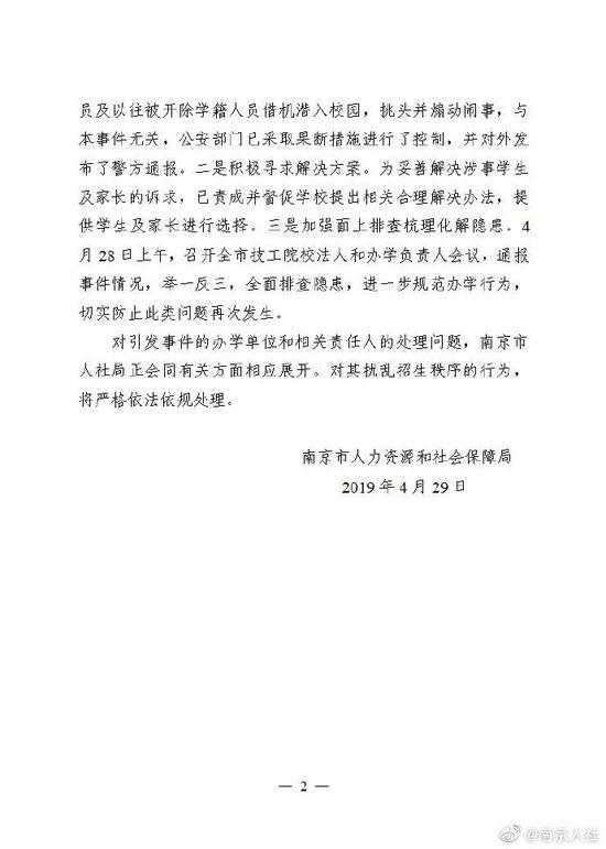 事件发生后,南京市人社局迅速会同有关方面,一是切实做好稳定工作。第一时间赶赴学校现场,指导学校与学生家长对话沟通,维护校园稳定。4月26日深夜发生个别校外闲散人员及以往被开除学籍人员借机潜入校园,挑头并煽动闹事,与本事件无关,公安部门已采取果断措施进行了控制,并对外发布了警方通报。二是积极寻求解决方案。为妥善解决涉事学生及家长的诉求,已责成并督促学校提出相关合理解决办法,提供学生及家长进行选择。三是加强面上排查梳理化解隐患。4月28日上午,召开全市技工院校法人和办学负责人会议,通报事件情况,举一反三,全面排查隐患,进一步规范办学行为,切实防止此类问题再次发生。