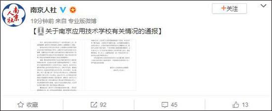 (观察者网讯)29日上午,针对有学生反映南京应用技术学校存在学籍及专业临时变更等问题,南京市人社局官方微博发布关于南京应用技术学校的情况通报。