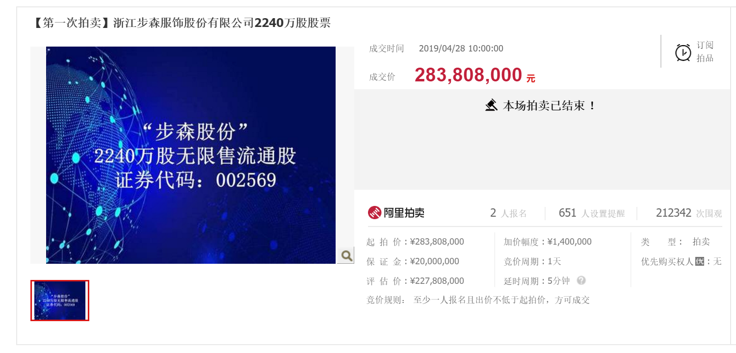 本次拍卖的股权是步森股份控股股东重庆安见汉时科技有限公司(下称“安见科技”)所持上市公司的全部2240万股股票,占步森股份总股份的16%。该次股权拍卖始于安见科技与华宝信托的2.5亿元债务纠纷,目前拍卖完成意味着10.66亿接盘的赵春霞巨亏出场,失去了步森股份大股东的身份。