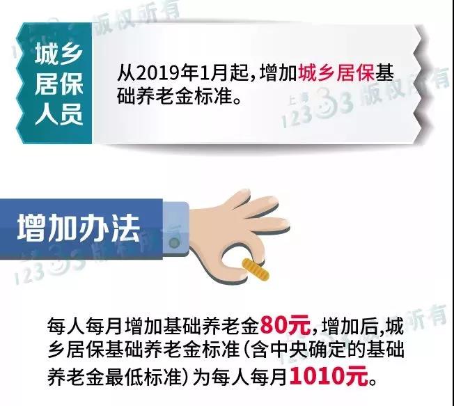与此同时,本市还将从2019年1月起,继续增加城乡居保基础养老金,每人每月增加80元。增加后,本市城乡居保基础养老金标准(含中央确定的基础养老金最低标准)为每人每月1010元。