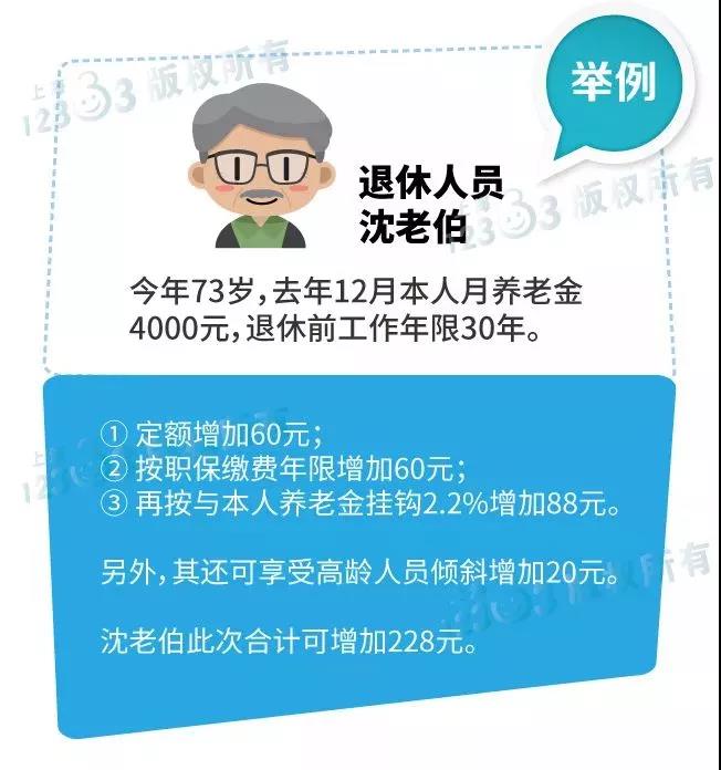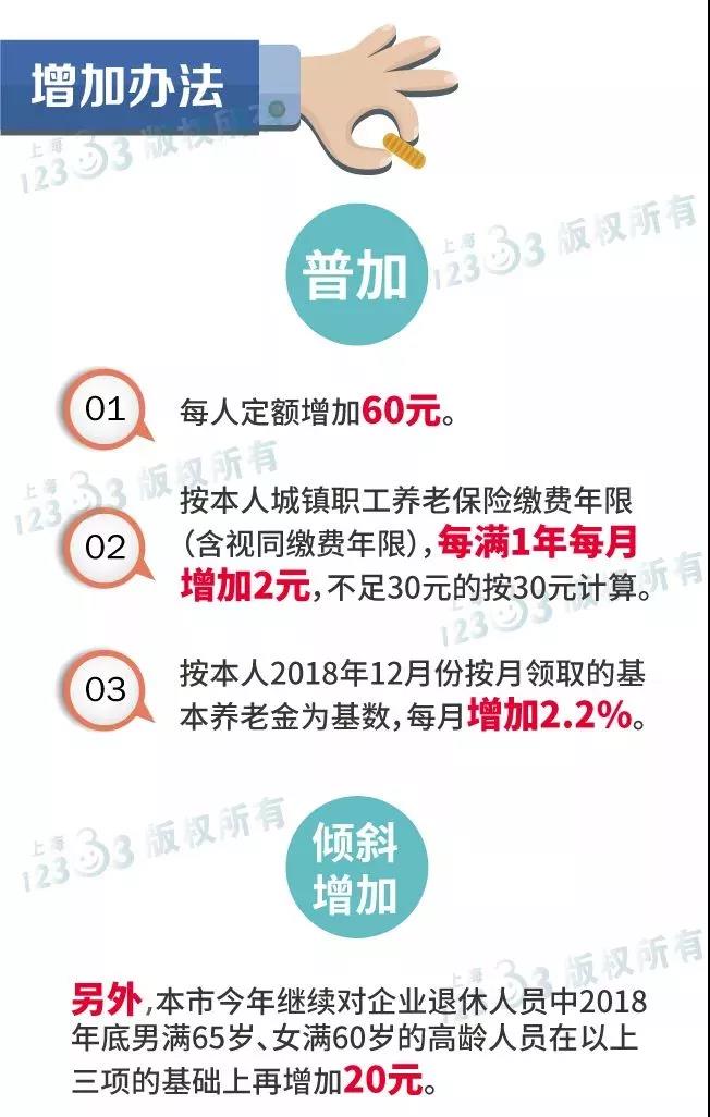 另外,为体现对高龄人员的关怀,本市今年继续对企业退休人员中2018年底男满65岁、女满60岁的高龄人员在以上三项的基础上再增加20元。