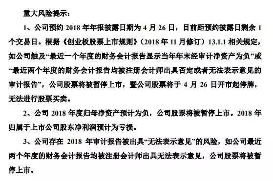 乐视网明确表示,公司预约的年报披露日期为4月26日,如果公司触及《创业板股票上市规则》(2018年11月修订)13.1.1相关规定,即经审计后上市公司2018年度归母净资产为负,公司股票将被暂停上市,暨公司股票将于4月26日开市起停牌,无法进行股票买卖。
