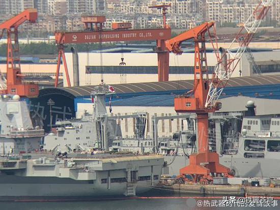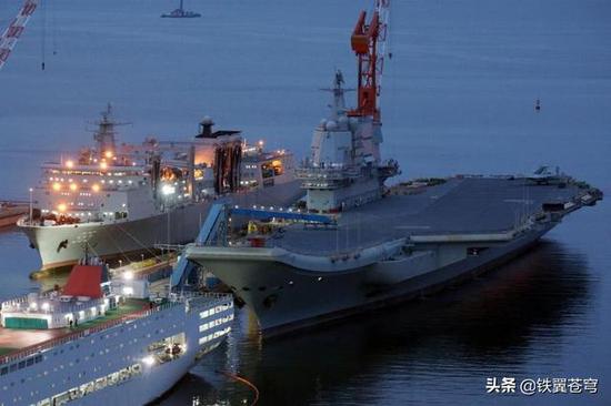 航母在进行出航之前,需要补给大量的油水和干货。如果仅仅依靠码头上的补给设备和车辆,可能需要很长的时间,甚至要几天几夜,耽误试航的进度。干脆,派一艘大型综合补给船靠近码头,同时进行多路补给,不仅效率提高了好几倍,还顺带演练了海上横向补给的基本套路。由于国产航母的补给装置都在右侧船舷,而码头右边是造航母的大船坞,于是就灌满水让补给舰开进去,隔着码头为航母输送物资。