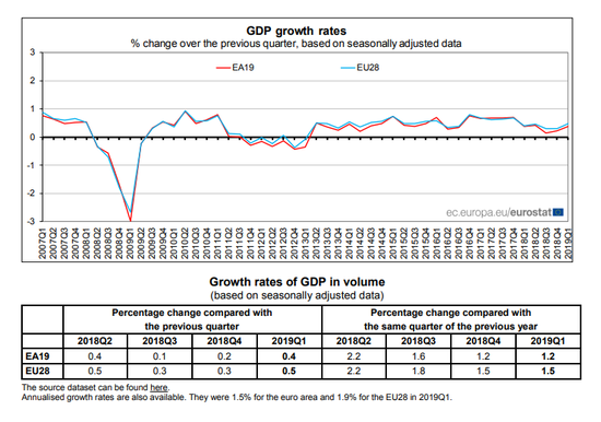 但一季度的数据显示,虽然退欧悬而未决,欧美贸易谈判压力颇大,再加上汽车行业疲软态势持续至今,欧元区经济仍具韧性,强劲反弹。