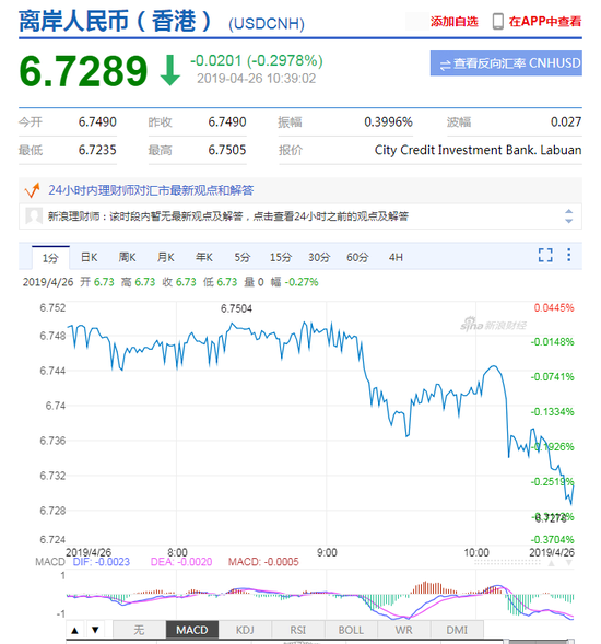 新浪财经讯 4月26日,离岸人民币升值收复6.73关口,日内升值逾200点。