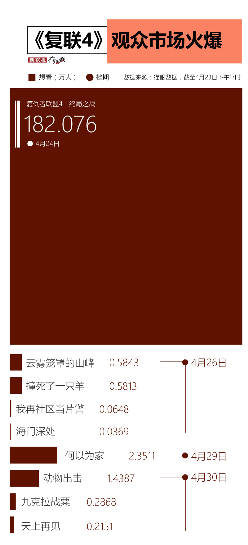 近期最热门的电影是什么?很多人的答案大概是《复仇者联盟4》(Avengers Endgame)(以下简称“《复联4》”)。作为一部美国超级英雄电影,《复联4》24日零时在中国全球首映,再加上漫威宇宙十年终章等原因,吸引了大量观众。某电影平台数据显示,在近期“想看”的电影中,想看《复联4》的观众有180多万,居于“想看”榜单的首位,排在第二位的仅两万余人。