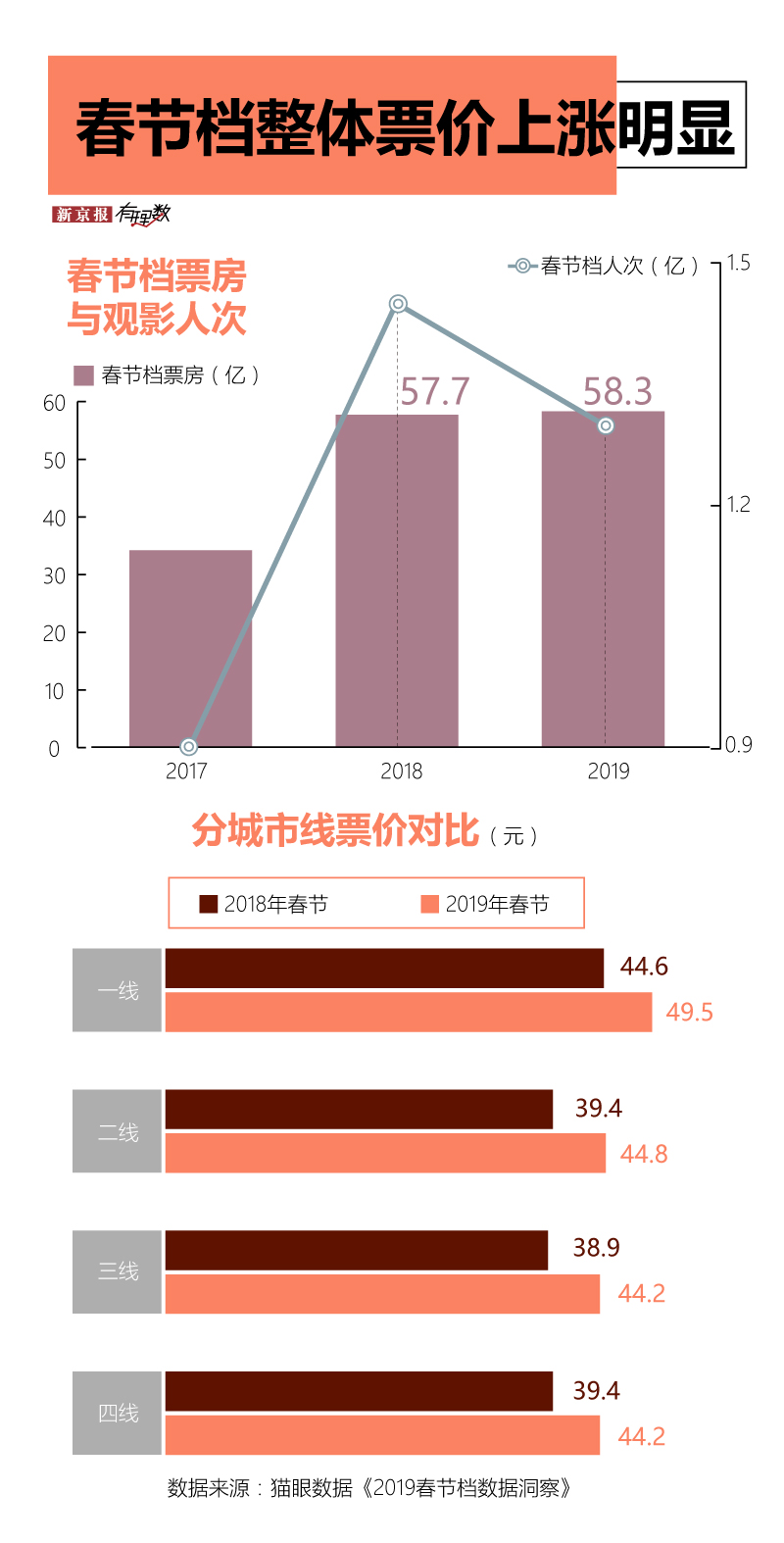 涨价不是个案,早在今年春节档,票价上涨就已经很明显。根据某电影平台数据显示,2月4日除夕至2月10日大年初六的2019年春节档综合票房超过58亿元,同比增长1.4%,而人次超1.3亿,同比下降10.3%,观影人次不及上一年,但票房却高于上一年。整体票价上涨明显,尤其是在二线城市。