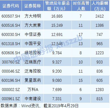 方大特钢、方大炭素、中信证券、中国平安四家企业高管年薪总额过亿元。其中方大特钢、方大炭素、绿地控股、万科A高管平均薪资超过了1000万元。