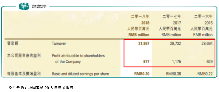 作为啤酒行业的龙头企业之一华润啤酒(00291-HK),在最新公布的2018年报中,实现营业额318.7亿元(人民币,下同),较2017年增长了7.2%;实现归母净利润9.8亿元,同比下滑16.9%,别忘了,2018年是世界杯,会对啤酒行业有较大的促进消费作用,但似乎华润的销售数据和利润数据并不可观,这也侧面反映出啤酒行业的竞争比较激烈。