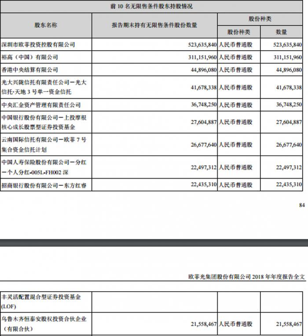 截至2018年末,香港中央结算公司持有欧菲光股票合计4489.61万股,光大信托持股4167.83万股、中央汇金持股3674.83万股、上投摩根核心成长持股2760.49万股。