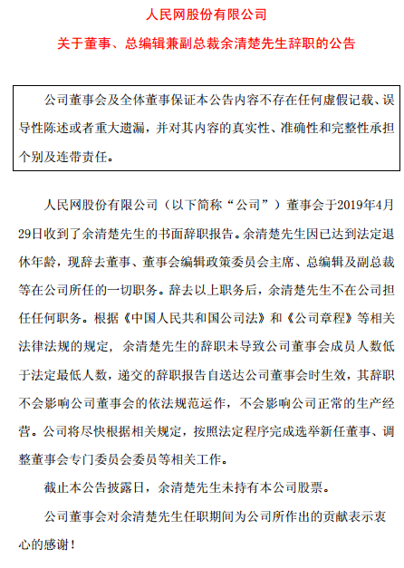 同时,人民网发布公告称,余清楚因已达到法定退休年龄,现辞去董事、董事会编辑政策委员会主席、总编辑及副总裁等在公司所任的一切职务。辞去以上职务后,余清楚不在公司担任任何职务。