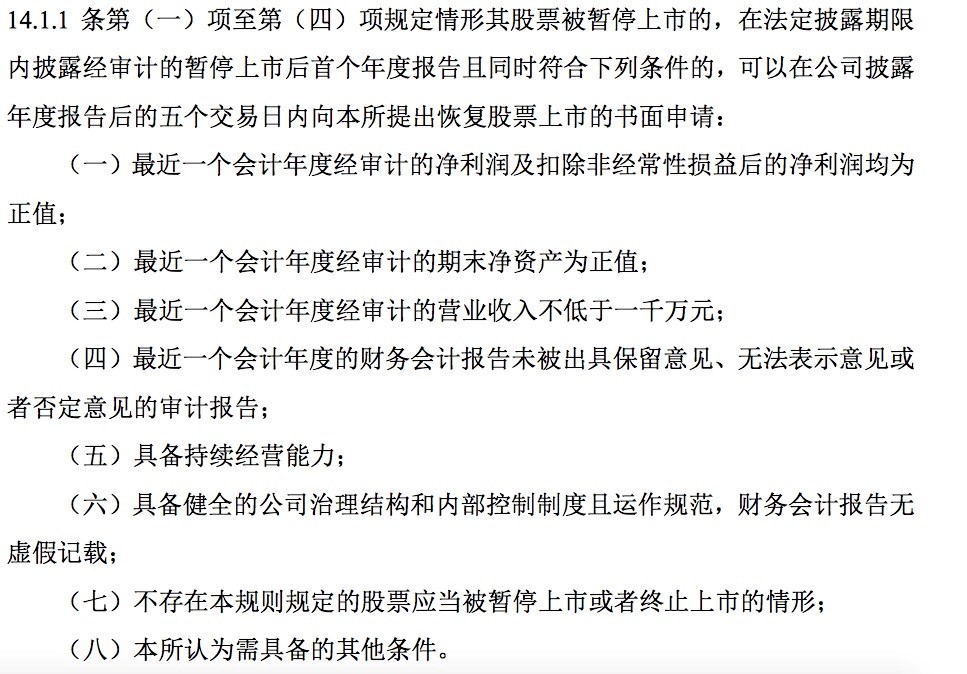 《国际金融报》记者查阅《深圳证券交易所股票上市规则》得知,*ST皇台暂停上市之后,根据其暂停上市的情形,要申请恢复上市,需要同时满足以下条件: