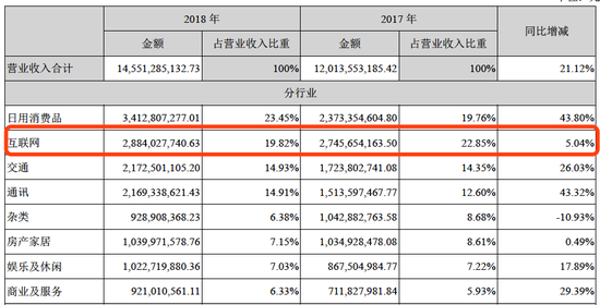 此外,分众传媒或将面临客户结构洗牌、广告主尤其是互联网类客户增长失速的问题。从分众传媒收入构成的行业分类可以看到,2017年营收占比最高的是互联网行业客户,然而在2018年来自互联网行业的营收仅有5.04%的增长,而日用消费品行业则大幅增长了43.8%,成为营收来源中最主要的行业。