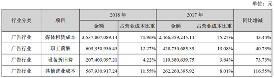 营业成本中占比最大的媒体租赁成本较2017年增长43.44%。其中,电梯电视和电梯海报业务的媒体租赁成本较2017年上涨58.33%,影院媒体租赁成本较上年增长24.39%。