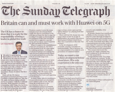 4月28日,英国主流大报《星期日电讯报》纸质版和网络版刊登刘晓明大使署名文章《英国能够也应该与华为合作建设5G网络》,并在报纸头版头条配发专题导读文章。