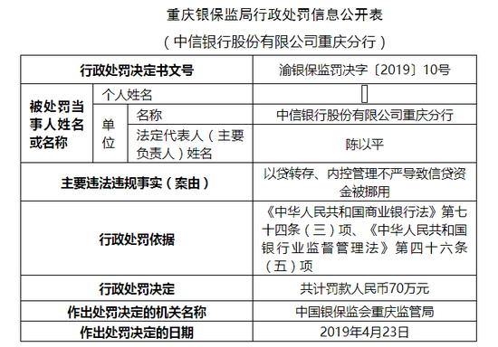 重庆银保监局决定对中信银行股份有限公司重庆分行共计罚款人民币70万元。