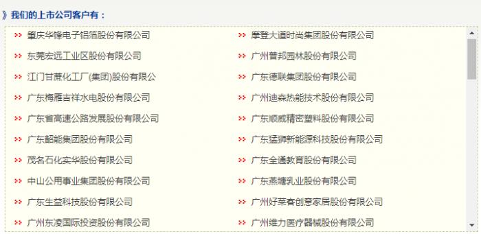 除了康美药业外,正中珠江服务的上市公司还包括茂名石化实华股份有限公司、广东全通教育股份有限公司、 广州普邦园林股份有限公司等上市公司,合计高达87家。
