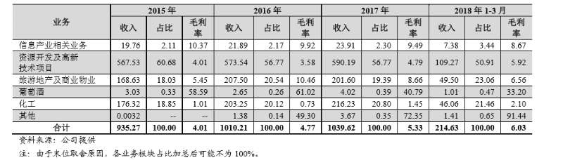 值得注意的是,在资源开发及高新技术业务的590.19亿元收入中,有色金属业务占到560.11亿元,其中407.93亿元来自毛利只有0.27%的有色金属贸易,占比高达72.8%;在旅游地产及商业物业业务的201.6亿元收入中,大部分由青海合一矿业有限公司贡献,而该公司主要进行大宗贸易活动,该公司2017年实现营收148.83亿元,利润总额只有0.33亿元;在化工业务的216.23亿元收入中,贸易类收入达到183.57亿元,占比达84.9%。