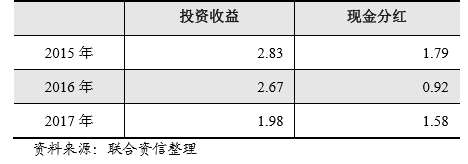 其次,在中信国安集团的投资收益中,比较稳定的有线电视业务的投资收益占比较小。2015年-2017年,中信国安集团的有线电视业务的投资收益分别为2.83亿元、2.67亿元、1.98亿元。