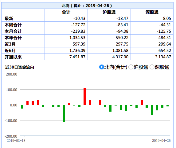 截至收盘,沪深股通共计净流出10.43亿元,其中沪股通净流出18.47亿元,深股通净流入8.05亿元。这也是本周净流出额最少的一天。
