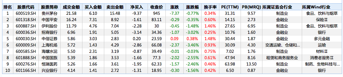 具体到个股来看,贵州茅台(600519)仍然为4月26日成交额最高的个股,共成交21.58亿元,买入6.01亿元,卖出15.48亿元,合计净卖出9.37亿元,也是4月26日净流出额最高的个股。