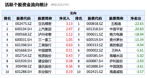 从近7日北向资金对活跃个股的操作来看,净卖出远多于净买入。Wind数据显示,近7日,北向资金净买入最多的个股为立讯精密(002475),净流入3.13亿元。上汽集团(600104)、泸州老窖、三一重工(600031)的净买入额也居前,均超过1亿元。