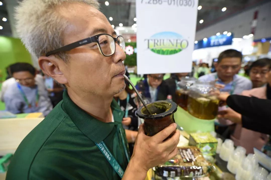 ▲资料图片:2018年11月7日,在进博会上,来自巴西的企业工作人员向参观者展示当地人饮用有机马黛茶的方式。(新华社)