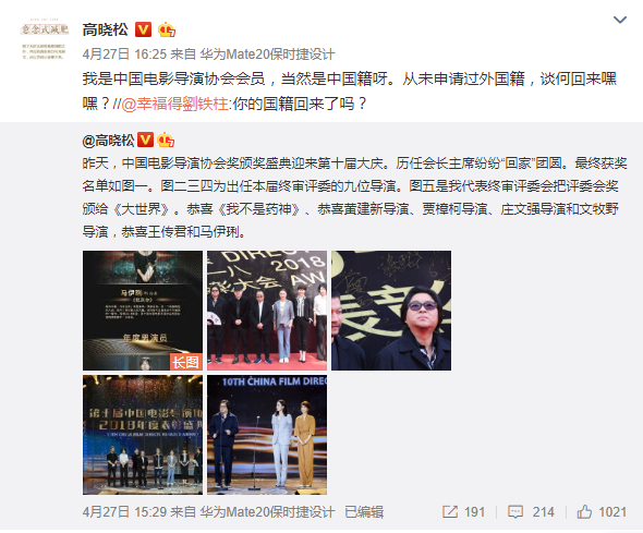 新京报快讯 27日,有网友在高晓松微博留言,问“你的国籍回来了吗?”,高晓松转发并回复道“我是中国电影导演协会会员,当然是中国籍。从未申请过外国籍,谈何回来?”