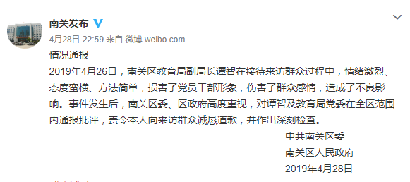 28日深夜吉林省长春市南关区人民政府在其官方微博发布关于此事的回应,2019年4月26日,南关区教育局副局长谭智在接待来访群众过程中,情绪激烈、态度蛮横、方法简单,损害了党员干部形象,伤害了群众感情,造成了不良影响。事件发生后,南关区委、区政府高度重视,对谭智及教育局党委在全区范围内通报批评,责令本人向来访群众诚恳道歉,并作出深刻检查。