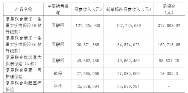 《每日经济新闻》记者注意到,该公司保费收入得以快速增长,互联网渠道销售的重疾险是当之无愧的“主力军”。年报显示,该公司2018年度保费收入居前五位的保险产品分别是“复星联合康乐一生重大疾病保险(B款升级款)”、“复星联合康乐一生重大疾病保险(C款升级款)”、“复星联合优选重大疾病保险(A款)”、“复星联合星赢一号护理保险”和“复星联合和睦医疗保险”。