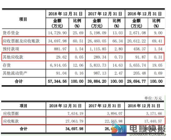 小编还注意到,尽管长阳科技的营业收入增长较快,但该公司的应收账款余额也比较大。2016年末、2017年末和2018年末,公司应收账款账面价值分别为1.7亿元、2.3亿元和2.7万元,呈逐年上升趋势。同期应收账款占流动资产比例分别为58.73%、56.58%和47.20%,占比也相对较大。