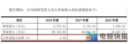 报告期内,长阳科技的研发投入金额分别为1045万元、2157万元和2737万元,在营业收入中的占比分别为2.75%、4.62%和3.69%,比例较低,最近一年甚至没有超过4%。