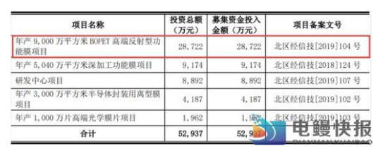 长阳科技计划募集5.3亿元资金,其中54%的资金将用于年产9000万平方米的BOPET高端反射型功能膜项目。