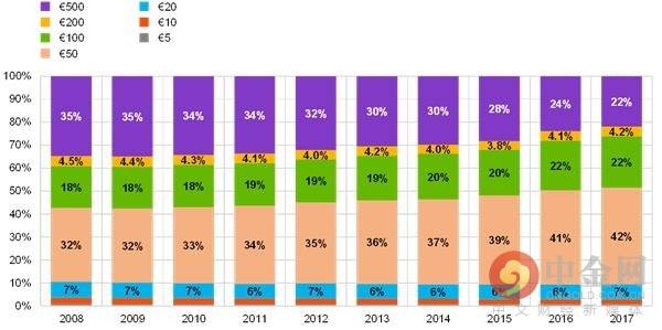 (流通中不同面值欧元纸币的份额占比)